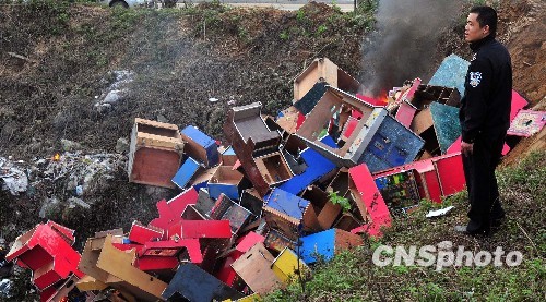 12月11日,福州警方集中销毁了一批赌博物品,包括赌博机40多台,赌博游戏机芯片585片,“六合彩”宣传材料11630份,价值130多万元人民币。这是今年9月以来福州仓山警方在辖区开展治安清查中缴获的非法赌博物品。中新社发 张丽君 摄
