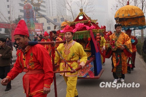 1月21日,河南郑州一对时尚新人,坐着八抬大轿结婚。据了解,时下越来越多的内地年轻人在选择这种古老的结婚方式。中新社发 晏立海 摄