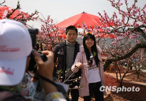 3月16日,成都市龙泉桃花故里景区举行相亲活动。桃花自古以来深受中国人喜爱,桃花在传统文化中,象征着爱情和美好生活。当地桃花节上推出第二届桃花情歌节、情定桃花.畅游柏合等以婚庆为主题的“粉红情人节”活动吸引了上百的年轻男女参与。桃花节推出的“粉红情人节”概念,为游客营造浪漫、温馨的感觉。图为一对年轻恋人桃花树下拍照留恋。中新社发 刘忠俊 摄