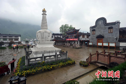 4月22日,“5.12”地震中遭受毁灭性打击的四川省汶川县水磨镇,经重建已恢复生机。该镇原是个羌、藏、回、汉等民族聚居的农业镇,援助重建的广东省佛山市充分利用当地多民族、多元文化的特色,斥巨资恢复当地禅寿老街,使之形成“汶川生态新城,西羌文化名镇,高原渡假水乡”的新风光。中新社发 郑祚声 摄