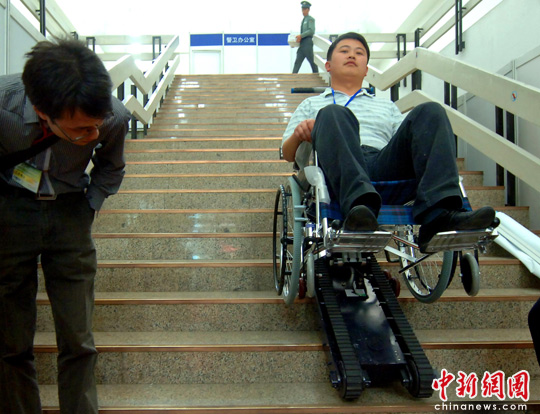 5月7日,“第十届中国国际健康产业博览会”在北京中国国际展览中心开幕。图为参展商推出上下楼梯代步车,吸引好奇的参观者。中新社发 邹宪 摄