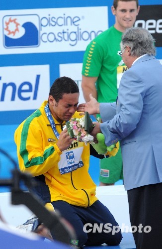 罗马时间2009年7月29日晚,2009年游泳世锦赛游泳比赛在意大利罗马进入第四个比赛日。在男子50米蛙泳决赛中,巴西选手席尔瓦以26秒76获得银牌。图为席尔瓦在颁奖仪式上跪地喜极而泣。中新社发 廖攀 摄