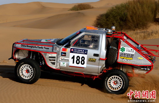 5月7日,2010年中国内蒙古库布其沙漠U2挑战赛进入第三天,参赛的50多辆赛车有许多出现迷路、陷车等故障。图为来自辽宁盛润福天合车队赵永国在比赛中发挥稳定。中新社发 赵振清 摄