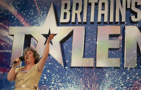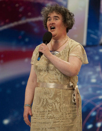 英国大婶级歌手苏珊·鲍以尔,当地时间24日晚间以动人歌声演唱音乐剧“猫”主题曲“回忆”,赢得评审及现场观众满堂彩,挺进独立电视台(ITV)选秀节目“英国有人才”决赛。图为4月苏珊大婶参加《英国达人》节目的资料图片。