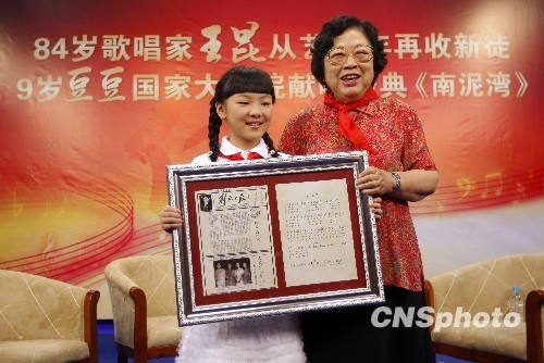 7月30日,以一首《南泥湾》唱红中国的84岁著名歌唱家王昆在北京喜收9岁新徒豆豆。王昆透露,9岁的豆豆将在8月9日的师生演唱会上,与其他弟子成方圆、李玲玉等同台演出,并和她一起演唱《南泥湾》。图为王昆将《南泥湾》当年终稿的歌谱和一张1945年报道王昆第一次演唱红色歌曲的《解放日报》作为礼物送给爱徒豆豆。中新社发 杜洋 摄