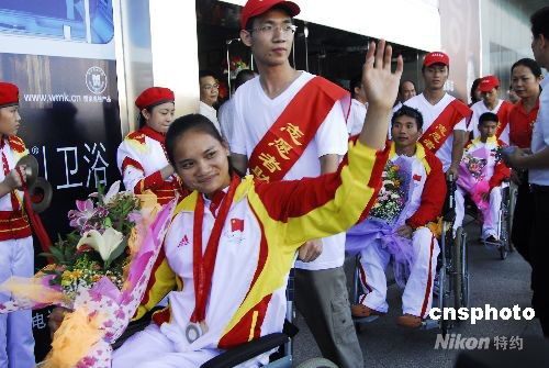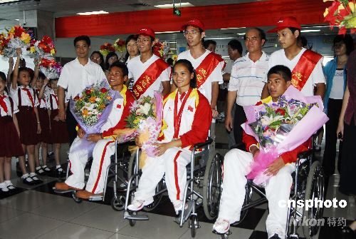 9月21日下午,广东省湛江市3名参加北京残奥会的运动员符洪芝、谭业腾和彭裕连自广州飞抵湛江,受到该市领导伍杰忠、徐志农、市残联和有关县(市、区)残联和亲朋好友的热烈欢迎。