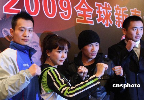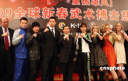 1月8日,2009全球新春武术搏击慈善大赛在北京举行新闻发布会。由中国国家体育总局武术管理中心与中国国际文化传播中心联合主办的“英雄传说”2009全球新春武术搏击慈善大赛将于18日在北京开赛。本次赛事融合了全球顶尖的格斗高手,著名的K-1世界自由搏击组织、WBC世界拳击理事会、WMC世界泰拳理事会、WKF世界空手道联盟等国际格斗组织联袂派出优秀选手参加比赛。届时中国的优秀格斗高手将与这些世界格斗高手进行夺霸较量,赛事的全部善款将捐赠给中国汶川大地震灾区人民重建家园。中新社发 钱兴强 摄
