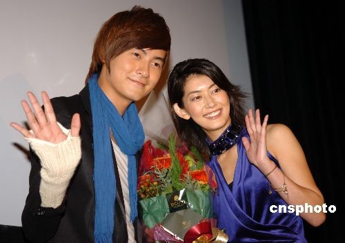 11月18日,台湾人气小生郑元畅在东京助阵日本版《恶作剧之吻》的DVD发卖,并首次与日版“相原琴子”的扮演者佐藤兰子碰面。二人本别披露各自的拍摄内幕,令现场近二百名粉丝大笑不已。图为郑元畅与佐藤兰子在活动现场向合影。中新社发 朱沿华 摄
