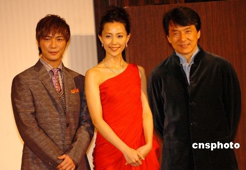 2月18日晚,本在云南拍片的功夫巨星成龙赶到东京出席2009日本香港观光交流年晚宴。作为香港特区的观光大使,成龙在活动现场向日本友人极力推介香港魅力。图为成龙与日本观光大使、著名女演员木村佳乃(中)及2009日本香港观光交流年亲善大使、日本当红小生成宫宽贵(左)一起合影留念。中新社发 朱沿华 摄