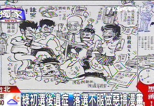 中新网7月1日电 据台湾TVBS电视台报道,民进党台北市议员提名已经完成民调初选,但初选造成的伤痕余波荡漾,被挤掉的现任议员陈嘉铭不服,质疑初选公平性,制作恶搞漫画丑化同党其它参选人,画中人火爆怒目、拳脚相向,就连“天王”苏贞昌也被画成香肠嘴跟大鼻孔。