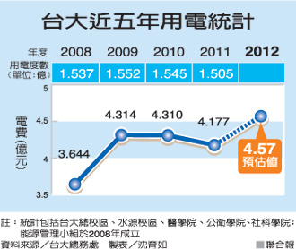 台大总务长郑富书表示,教学型大学白天师生上课,晚上校内人数减少,电力使用就下降。但台大为研究型大学,24小时都有师生在做实验,也有教授在办公室写论文,用电量自然会多。再加上台大师生与行政人员,是其它学校的2倍以上,将台大的电费与人数相除,其实与其它大学差不多。