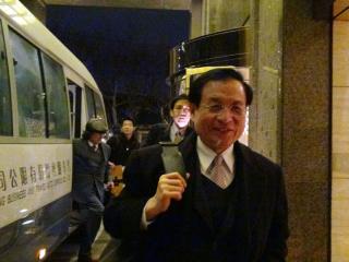 许添财20日率团访问上海,他接受媒体访问时强调此行无关政治。图为他抵达下榻饭店。 图片来源:台湾“中央社”