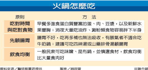 蔡蕙君说,冬天吃火锅要看体质,记得先顾好肠胃。肠胃不好,吃再多肉类、补品也无法吸收,可选择吃四神汤或山药排骨汤。一般民众为避免上火,可吃味噌、昆布锅、蕃茄锅等汤底较温和,并慎选食材,多放些蔬菜,饮食均衡比大量食肉好。