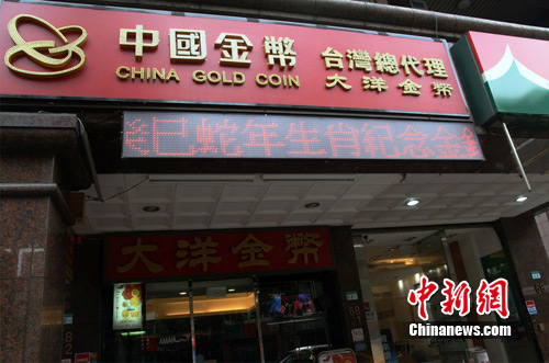 台湾大洋金币公司在其位于台北市和平东路三段的门店,以跑马灯推介中国人民银行发行的蛇年生肖纪念金银币。