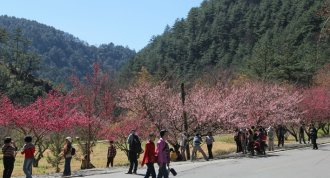 武陵赏樱季其实很长,从元月可以延续到3月间,元月冬末最先开花的是台湾原生的绯寒樱,农场内栽种数量不少,游人开车走台七线和台七甲线公路到武陵,一路有开红花的台湾山樱引领入园,武陵路两旁则可见成排的单瓣和重瓣山樱。