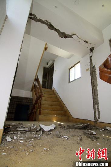 3月27日上午10时3分,台湾南投县发生6级以上地震,台北市区震感强烈。图为台中市大里区的一栋住宅楼内,天花板和墙面都震裂开来。图片来源:东方IC 版权作品 请勿转载