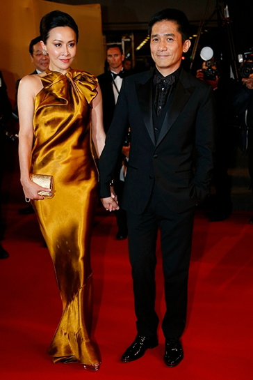 刘嘉玲LANVIN 的金色蝴蝶结礼服更是艳光四射,身旁的梁朝伟巨星风采也完全被掩盖住了。 (图/台湾联合新闻网)