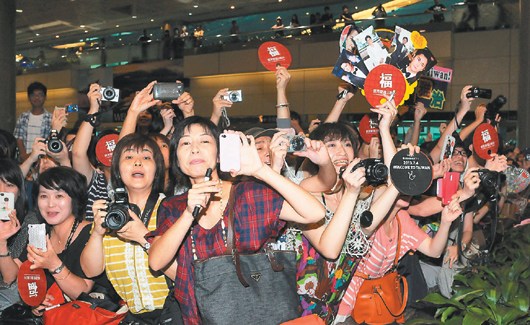 中新网7月5日电 据台湾《联合报》报道,日本“黄金单身汉”福山雅治4日下午为新片《破案天才伽利略:真夏方程式》来台,影视歌三栖的福山雅治人气爆表,在桃园机场有近400名粉丝接机,傍晚首映更吸引超过1500名影迷,所到之处尽是尖叫与欢呼。