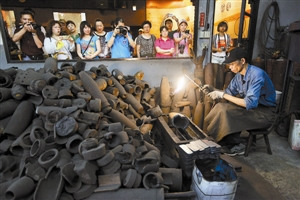 “金门的人用我家的菜刀,台湾的人也用我家的菜刀,大陆游客也喜欢买!尤其是大陆西部地区的客人,上次有个爱刀的内蒙古游客,一次买了二三十把刀!”吴师傅的太太洪秀暖在一旁插话说。“我是做菜刀高手,那我家老板娘就是用菜刀高手!”吴师傅笑道。