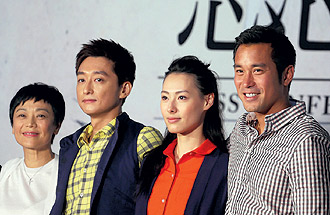 导演张艾嘉(左起)执导新作《念念》,3日在台北举办记者会,本片演员柯宇纶、梁洛施、张孝全一同出席与媒体见面。台湾“中央社”图