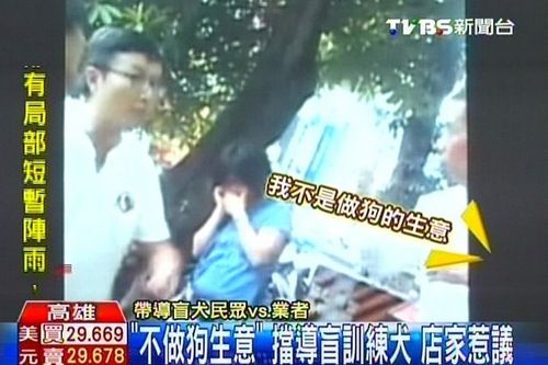 中新网9月10日电 据台湾TVBS网站报道,台湾民众带训练中的导盲犬到台湾高雄市一家牛排馆用餐,却被挡在门外,店家无视相关文件证明,说什么都不让导盲犬进入,就在门口与民众发生口角,过程被上传网络,引起热烈讨论。
