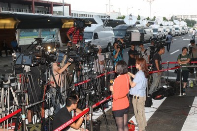 王金平10日晚从马来西亚返回台湾,媒体在机场等候。台湾“中央社”图