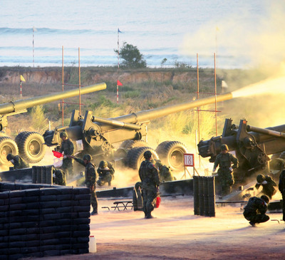 金门重炮实弹射击演习23日清晨在金门县金宁乡海边举行,155加农炮发射后,现场火光、硝烟四散。台湾“中央社”图
