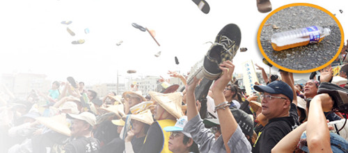 混乱中,有抗争民众在现场用塑料瓶装小便,再朝障碍物砸去,现场尿液飞溅,“臭死人了,为什么要这样?”许多抗议民众也被尿液喷到,有人气得说,“不是要和平理性的丢鞋表达诉求吗?怎么又害我们看起来像一群暴民。”