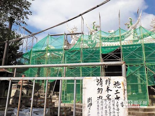 图为天后宫建筑体受损情形,封闭整修长达5年,工期一延再延惹民怨,遭质疑修复工法错误失真。图片来源:《中国时报》