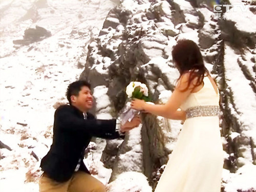 台湾合欢山降春雪 俏新娘穿薄纱留倩影(图)