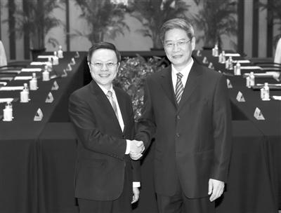 昨日,国台办主任张志军(右)在南京与来访的台湾方面陆委会负责人王郁琦(左)会面。 新华社发