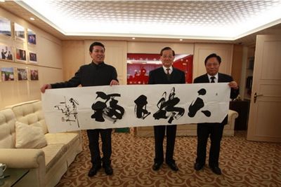榜书家赵昌林向连战赠送了榜书作品《天赐百福》。来源:人民网