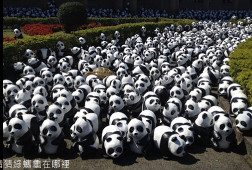 猜猜绿蠵龟在哪里。“猫熊世界之旅-台北快闪行动”2月24日前进台北市自来水博物馆,出动志工摆放1200只纸猫熊,并穿插神秘客绿蠵龟,吁民众保护海滩,让绿蠵龟有生存空间。(来源:台湾“中央社”)