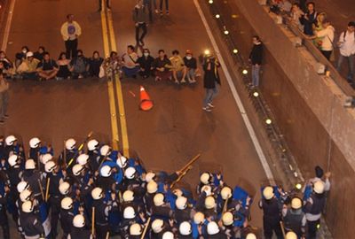 警方凌晨三点对占领展忠孝西路民众展开驱离。来源:台湾《联合报》