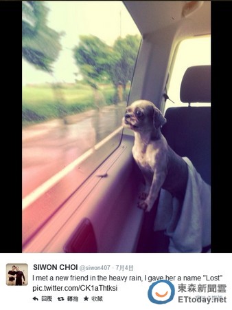 不过,事后始源就在自己的推特记录下这段奇遇,并用英文写下“我在大雨中遇见了一位新朋友,我帮她取了一个名字‘Lost’。”并附上狗狗坐在车里望向窗外的照片,小小义举感动不少网友。
