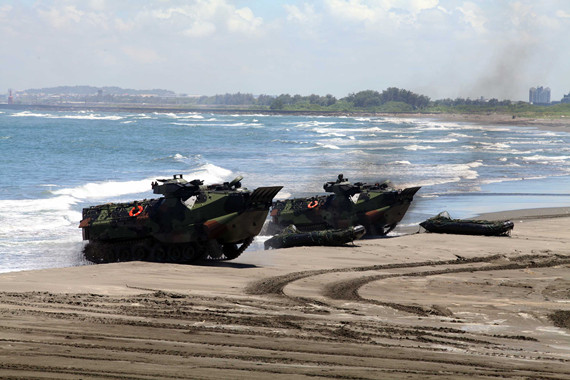 马英九11日南下海军高雄左营军区海军陆战队,并视导由陆战队两栖部队的AAV7两栖突击车进行的抢滩。“中央社”