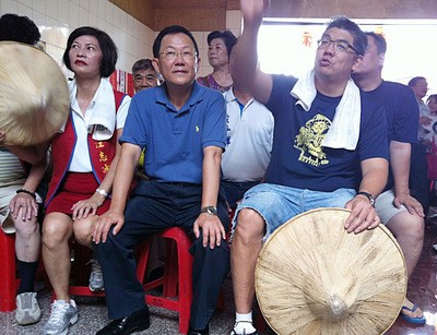 北投割稻趣体验活动今天在位于北投区的福德宫举行,身穿T恤、短牛仔裤的连胜文首先戴上斗笠、脱下球鞋换上夹脚拖,走到田边时即赤脚走入有积水的田中,体验割稻及脱谷。
