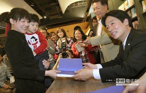 中新网2月27日电 据台湾“中时电子报”报道,台南市长赖清德新书发表会在台中市勤美诚品举行,台中市长林佳龙特地作陪,两人并相互推崇对方的施政理念;许多粉丝挤爆现场排队索取签名。