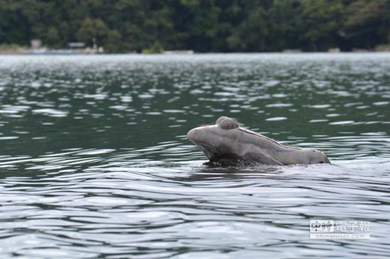 日月潭“九蛙迭像”只剩1只露脸。图自台湾“中时电子报”