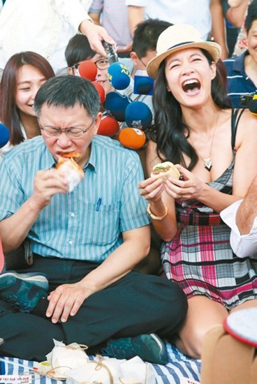 台北市长柯文哲(左)昨猛吃三明治,让在旁的女主持人Janet笑开怀。图自台湾“中时电子报”