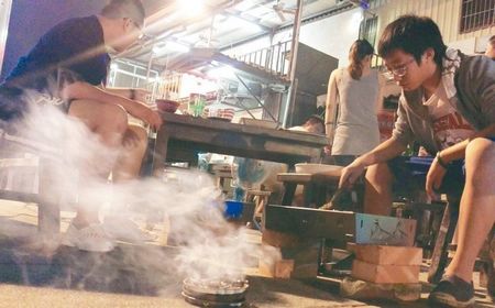 南区黄姓市民在大门外骑楼搭起露营帐篷,一家人挤在里面烤肉,他说,帐篷有通风口,可防蚊又不闷热,“希望明年没有登革热,别再这样一面担心一面烤了”。
