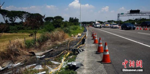 7月23日,台湾“7·19”游览车事故大陆罹难者家属来到桃园市高速公路事故现场悼念亲人。图为事故发生地,仍保持事发时刻触目惊心的景象。中新社记者 陈孟统 摄