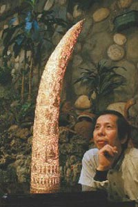 中新网12月29日电 用2公斤多黄金,雕塑出来的金象牙会是什么模样?彰化县鹿港镇金雕师傅郑应谐,花了近一年时间,打造一支1米高的象牙造型金雕,上面刻有205尊佛像。由于黄金成本即接近150万元(新台币,下同),他特地为这件新创作投保500万元。