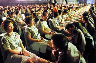 中新网7月2日电 据台湾《中国时报》报道,台湾脚底按摩名闻遐迩,台当局观光部门1日在台北小巨蛋举行“千人足健体验”,邀请千名旅客与千名足健师傅,同时进行足健体验,创造“最多人同时体验足部反射疗法”的世界纪录。