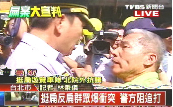 中新网9月11日电 陈水扁家族弊案今日下午一审宣判,这场世纪大审判备受关注,众多挺扁以及反扁的民众聚集在台北地方法院周围,两方阵营频爆冲突,警方则绷紧神经维持现场秩序,不过仍有互殴及袭警的现象。