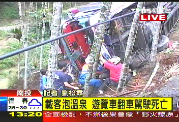 中新网9月27日电 据“中央社”报道,1辆游览车27日上午在南投县国姓乡玉门关景点附近,疑因煞车失灵滑落山沟,所幸车上31名游客已先下车,司机侯文田则遭车体压住,经消防人员救出送医急救仍告不治。