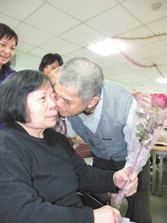 夫妻俩鹣鲽情深,长赡养护中心主任张纮宇赞誉郭宪章是“现代新好男人”典范!两人结褵51年,没庆祝过情人节,昨天郭宪章在友人起哄下,带着1朵红色玫瑰花现身赡养院,表情腼腆,他双手僵硬地把玫瑰花送到妻子面前,但怎么也“挤”不出“我爱你”三个字,旁人猛起哄亲一下,2人当场红了脸。