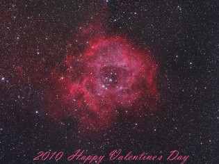 中新网2月9日电 据台湾“今日新闻”报道,台湾“中央气象局”玩起浪漫,今年西洋情人节正逢农历大年初一,气象局将位于冬季星空的“玫瑰星云”影像照片,加了一行”2010 Happy Valentine's Day“(2010 情人节快乐)的粉色英文字,提供网友自行下载。