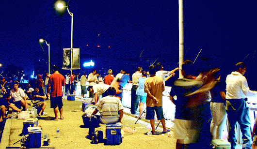 中新网9月27日电 据台湾《联合报》报道,高雄市前镇区中华五路上的金巩桥,从“莫拉克”台风后至今,每天夜晚都聚满钓客下竿钓虱目鱼,连外劳都钓得笑哈哈,有些钓客还出动亲友团,边钓边喝酒,使得桥上宛如夜市。