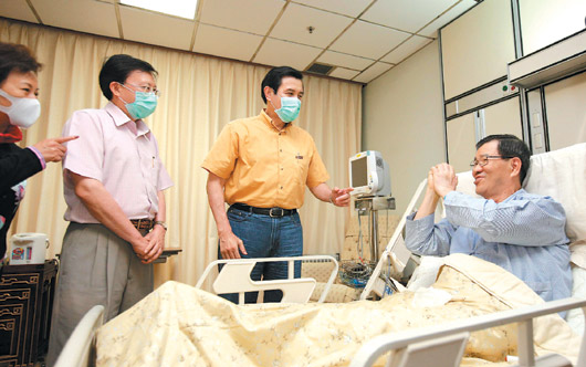 中新网5月25日电 据“中央社”报道,马英九24日晚间偕同台当局“行政院长”刘兆玄前往台北荣民总医院,探视进行肺部肿瘤切除手术的萧万长,马英九希望萧万长安心静养,早日康复。